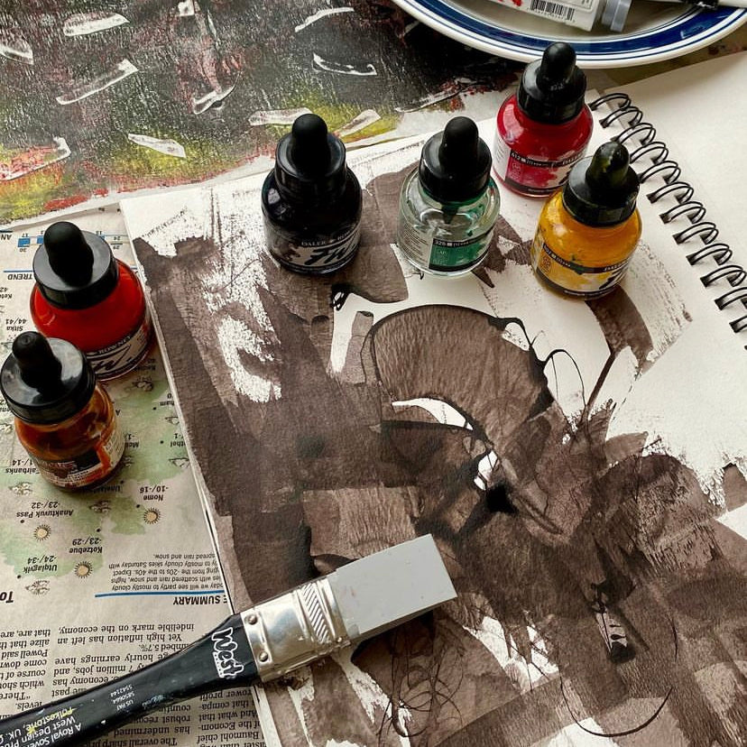 Working from my home studio, I love mixing up new acrylic ink colours for my pieces.